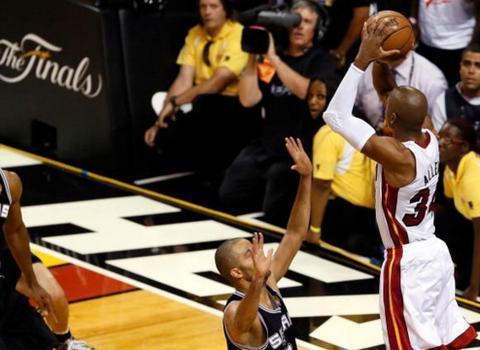 雷阿伦的经典绝杀早就传奇,在2012-13赛季的总决赛,詹姆斯领衔的热火2-3落后邓肯的马刺,第六场的世界大战。最后时刻两队还是打得难解难分,最后5.2秒,热火还是落后3分。当马刺球迷开始欢呼的时候,站出来的是老将雷阿伦,最后接球后撤步自信三分出手,球应声落网,扳平比分,马刺没有暂停,最后马刺开球冲到前场上篮未果,拖入加时的热火击败了马刺,最终通过抢七还夺得了总冠军。雷阿伦的那一个三分球可以吹一辈,詹姆斯的第二冠应该要感谢雷阿伦。